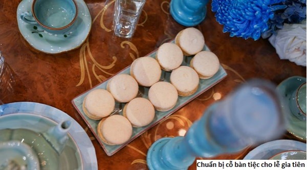 Bàn tiệc được trang trí theo tiêu chuẩn sang trọng và tinh tế. Bàn ăn gia tiên và cả gia đình nên thống nhất theo một gam màu chủ đạo cụ thể, có tính liên kết với nhau và tạo nên một không gian thẩm mỹ, mang lại cảm giác thoải mái cho mọi người khi đứng trong căn phòng gia tiên. Bàn tiệc gia tiên còn có vai trò làm nổi bật trang phục của cô dâu chú rể, tạo khung cảnh tươi tắn, lãng mạn như khăn trải bàn, hình ảnh đôi trẻ trên bàn, hoa tươi. Ngoài việc tạo không gian ấn tượng, là một không gian đẹp địa điểm chụp ảnh hoành tráng để đôi tân lang tân nương cùng hai bên gia đình ghi lại khoảnh khắc và lưu lại những kỷ niệm trong ngày vui của mình.